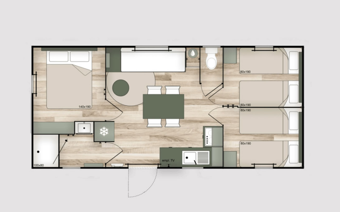 • 2 chambres avec chacune 2 lits simples (80×190)